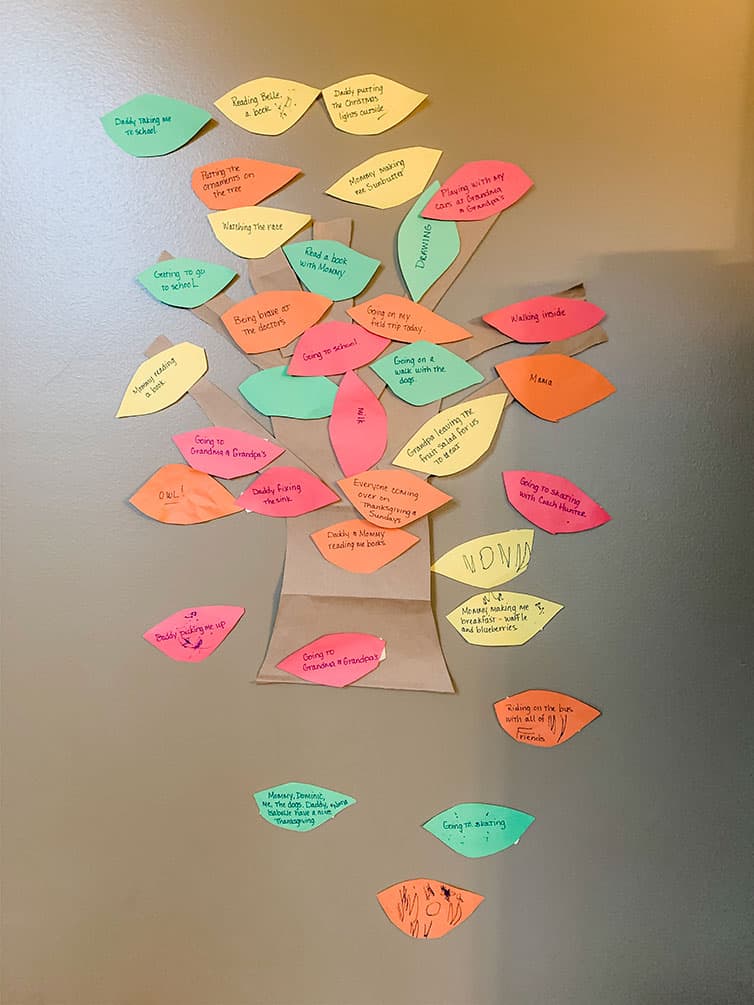 2. Back at the end of October, I got a craft idea for a โthankful treeโ in one of the parenting emails I subscribe toโฆ I thought the boys would enjoy cutting out branches since they like art projects, but I didnโt really think the whole writing down something that they are thankful for every day would take off. OMG I WAS WRONG. This was easily one of their favorite things we have ever done. They BEGGED me to โdo our thankful leaves!โ โ write things down that made them happy or they were thankful for more than once a day. It made my heart swell with pride, listening to them tell me what to writeโฆ and it gave me such perspective. The things that made them the happiest? Reading books together, me making them lunch, Daddy picking them up from school, playing with friends, drawing, walking the dogs. It truly is all of the little moments, the simple thingsโฆ Once the month was over, Joseph begged me to do something special for Christmas, too, so I replaced the fall tree and leaves with a Christmas tree, which weโll cover with โthankful ornamentsโ during December :)