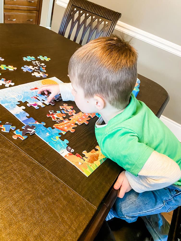 At Dominicโs parent/teacher conference a couple of months ago, his teacher mentioned that he really loved (and is good at) puzzles. After that, he started doing them more at home, on his own, and with ease. This week, he completed a 72-piece puzzle with very little help from me. Heโs definitely in the zone with a puzzle (boy after my own heart!).