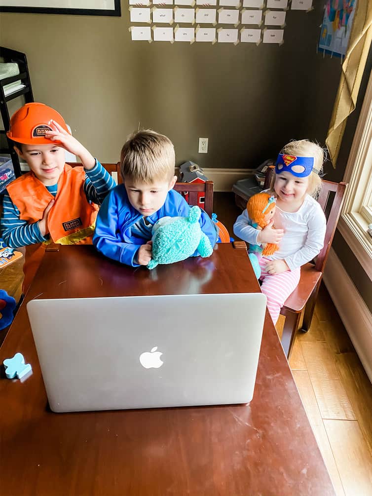Since the boys are only in preschool, we donโt have any mandated learning or teaching we need to do, but Dominicโs teacher set up Zoom meetings for the days they would have been in school and they have their 15 minutes of โcarpet timeโ together. They sing their hello and goodbye songs, she taught them a new letter, read a book, and yesterday they did a virtual show and tell. Joseph and Isabelle love sitting in, too ๐