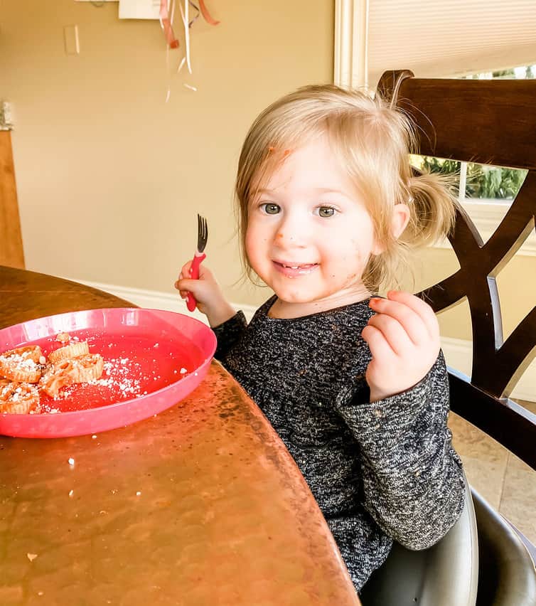 5. Isabelle loves her pasta! She has also been obsessed with that Superman mask for the last week and has worn it nearly 24/7 ๐