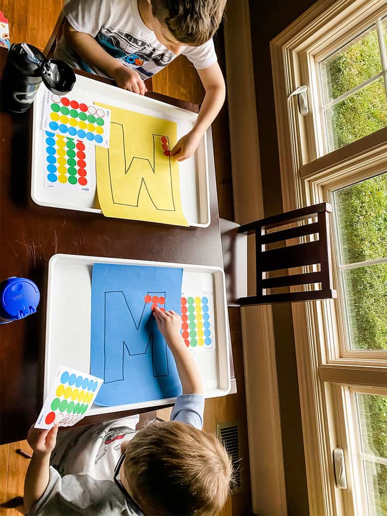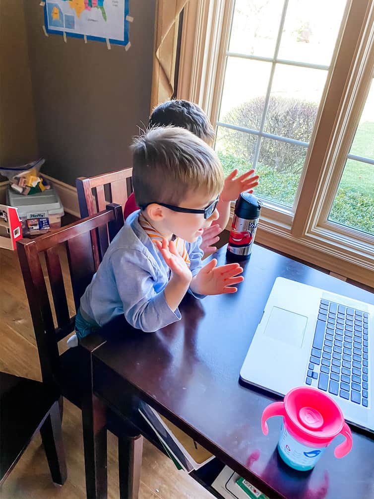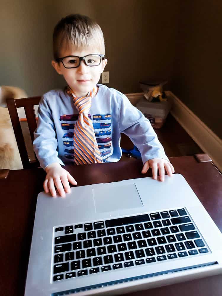 3. Both boys have had some online class time this week and Joseph gets excited any time there are new worksheets to do. Dominic had show and tell yesterday for the letter โNโ so my husband got him decked out in a necktie ๐
