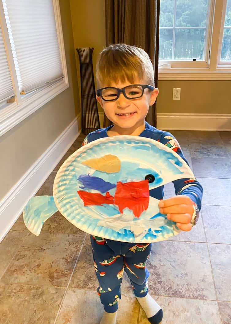 2. Dominic only has a snippet of class on Zoom, and then we have some crafts and activities to do at home. He made a rainbow fish this week and was SO proud of it โค๏ธ๏ธ