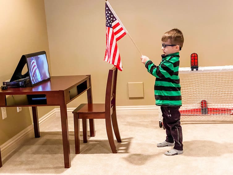 2. Dominic was very serious about holding a flag for the Pledge of Allegiance during a preschool online snow day last week ๐