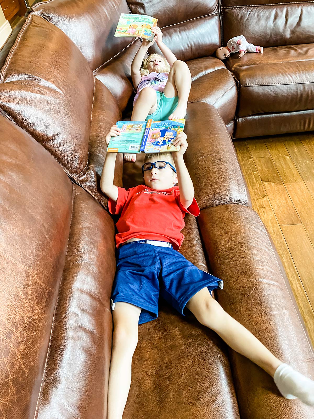 3. I found these two on the couch like this after I finished cleaning up from lunch. I love that they love books!