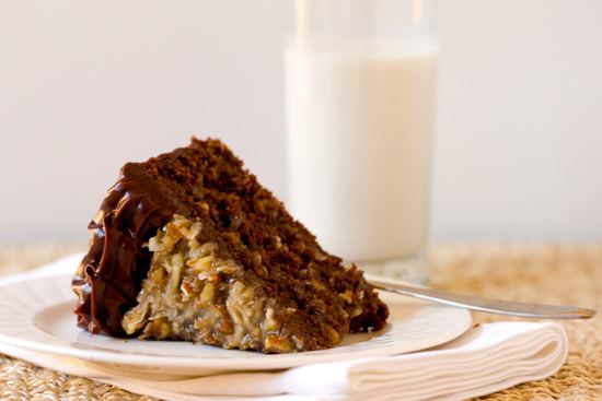 This recipe was actually my second go at German Chocolate Cake recently, and Iโm pretty confident it will be my last. I first turned to my usual trusted source for classic recipes when I set about making the cake, but ended up being surprisingly disappointed. The cake layers were wispy thin and the chocolate flavor was severely lacking. I started my search over and when I came across this recipe I thought it looked extremely promising. It was described as a โbig, tallโ cake with four layers brushed with a rum syrup, lots of filling and iced with a fantastic chocolate ganache. This cake delivered and then some.