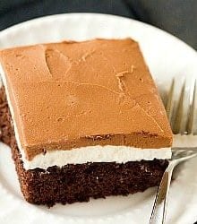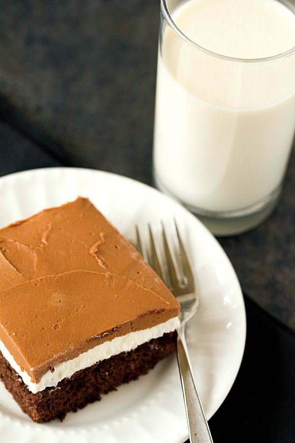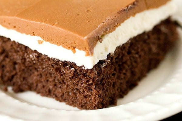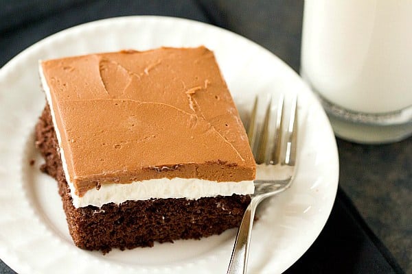 This cake is a phenomenal recreation of all the flavors that make Ho Ho snack cakes so irresistible. A basic chocolate cake (I used a Dark Chocolate Fudge variety) is topped with a fluffy white frosting, and then a chocolate icing. My aunt mentioned that she sometimes makes the cake like a traditional roll cakeโฆ turn out the chocolate cake and roll up (same process as my Angel Food Cake Roll), then once cool spread the filling all over it, and roll back up. Finally, cover the outside with the chocolate icing. It looks like one big Ho Ho! My guess is that itโs more popular during the holidays because people assimilate the โho hoโ name with the โho ho hoโ associated with Santa Claus at Christmas. Whatever the reason, I donโt need an excuse to down plate after plate of ridiculously delicious chocolate cake.