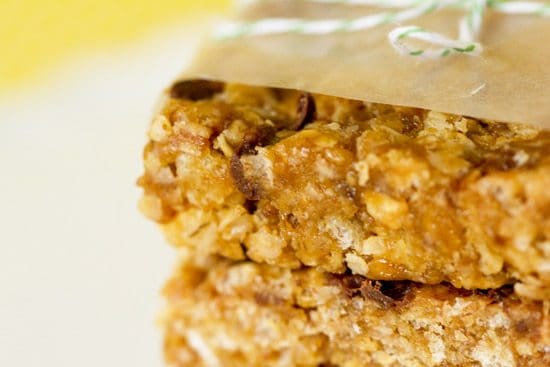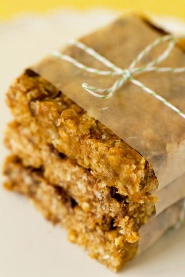 Even though there isnโt anything inherently โbadโ for you in these bars and they are certainly a step above your typical processed granola bars, but I still relish making anything I can from scratch in my own kitchen. I grabbed the wrapper to study the ingredients, did some Googling and finally came up with these bars. I absolutely love them โ theyโre sweet, chewy, a little crisp and packed with flavor. These are sweetened with brown rice syrup, donโt include any sugar and are gluten-free. These make an awesome snack, and are a perfect substitution for breakfast or lunch if youโre running late or on the go.