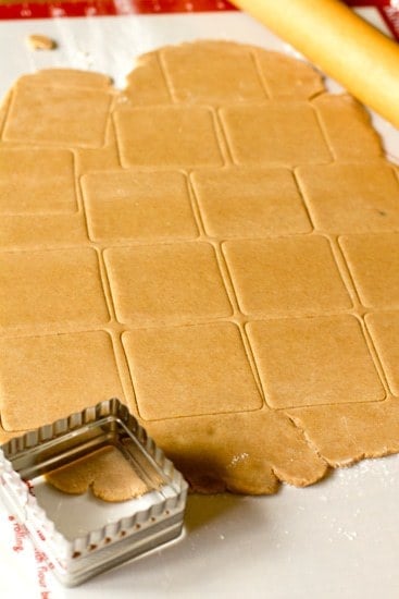 • On a lightly floured surface, roll out the dough to a 1/8-inch thickness and cut into 3-inch squares. Transfer to the baking sheet, spacing the crackers at least ยพ-inch apart, gather any scraps, re-roll, and cut out more cookies.