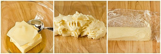 When you drain the raisins, save the whiskey that you soaked them in and use that to get to work on your whiskey butter. The butter is very simple to make – you combine a little of the leftover whiskey and some sugar in the microwave, then let it cool down. Once cool, you blend the mixture into room temperature butter to completely combine. You can form the butter into a “stick” of butter or store in a plastic container or ramekin.