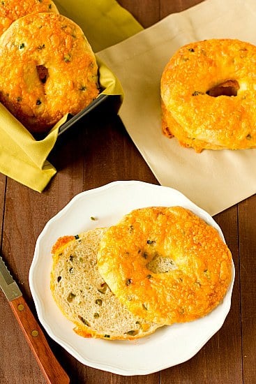 Cheddar cheese and jalapeño peppers are one of those savory matches made in heaven. The savory equivalent of peanut butter and chocolate, in my book. Sharp, creamy cheese is the perfect complement to crunchy, spicy peppers, and the two inevitably become constant companions in many dishes. A couple of examples include Jalapeño Cheddar Cornbread and Jalapeño Popper Dip. Those are just the tip of the iceberg when it comes to all of the ways that Cheddar and jalapeños work their magic together. A few years ago I tagged along with my Chief Culinary Consultant and his parents on a Costco run while they were in town for a couple of weeks. We shopped ’til we dropped (well, until the cart was full and we had to start thinking about where we were going to put everything in the car). When we spun through the bakery section, the two of us snatched up some jalapeño cheese bread/rolls, which looked particularly inviting, with melted, crusted cheese covering the top. No sooner had we gotten into the car with our token fountain drinks, we decided we were starving and needed to eat that bread, immediately. (We never really grow up, do we?) It was delicious – cheesy, wowza-level spicy, and the perfect afternoon snack. Ever since, I’ve had jalapeño cheddar bagels on the brain, but for one reason or another have never gotten around to making them. Until now. And now, I think I might have to keep my freezer stocked with them, because they are bagel perfection.