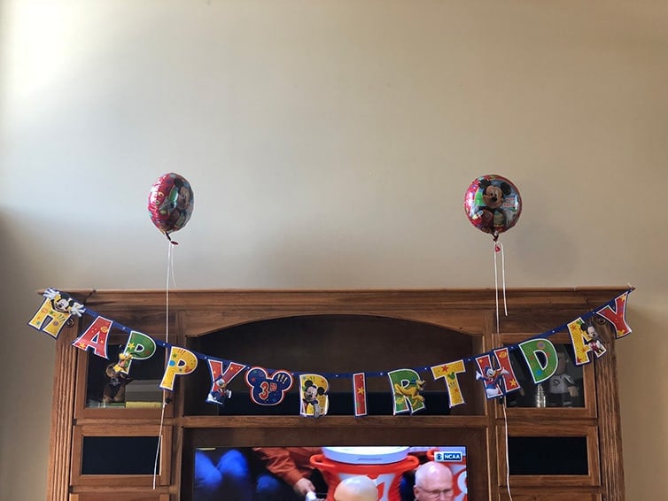 I never go over the top with tons of crazy decorations; usually one trip to Party City is all I need! I got coordinating plates, napkins and cups, a set of Mickey Mouse balloons, a big blue number three balloon, and a birthday banner.