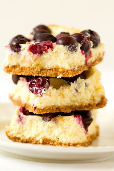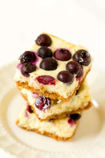 It’s no secret that I am an unadulterated cheesecake fanatic. If it’s on a menu, I can’t turn it down. It’s my birthday cake of choice, and I’ll come up with the most obscure excuses to bake one up at home. I love trying new varieties when out, and experimenting with new recipes when at home. If there ever happens to be time when I don’t want to make a full-blown cheesecake, I’ve found cheesecake bars to be a more than acceptable substitute. In some cases, they’re (gasp) even better. You can pick them up and eat them without a plate and a fork, and you don’t feel nearly as guilty if you eat multiple pieces (I speak from experience, of course). In the past, I’ve whipped up Chocolate Chip Cookie Dough Cheesecake Bars, Dulce de Leche Cheesecake Squares, and Eggnog Cheesecake Bars, all of which were amazing. With summer on our doorstep, I was salivating just thinking about the bright, fresh flavors of cheesecake bars loaded with lemon and blueberries. Cheesecake is my favorite dessert, and blueberries are absolutely my favorite fruit, which makes them a match made in heaven!