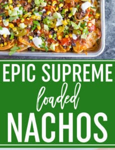 We do not make nachos at home very much at all, but we WILL order them when weโre out, which, HA, is not often anymore. But back when we used to go out to eat a lot, amazing-sounding nachos on an appetizer menu was a must-order. Theyโre the best loaded up with tons of delicious toppings, and these supreme loaded nachos seriously take it over the top.