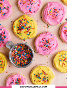 - Once cookies have cooled completely, frost and add sprinkles. Allow frosting to set, then store in an air-tight container. Let cookies sit for several hours before serving to allow the flavors to develop.