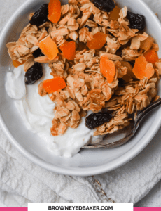 Your quest for the best homemade granola can stop right here because I promise this is it! Lightly sweetened with maple syrup and brown sugar, this bakes up into crunchy, chunky granola that you can break apart into big or little pieces. I stir in dried fruit at the end (dried cranberries and apricots are my favorites!) but the possibilities with this stellar base granola recipe are absolutely endless. A perfect breakfast on its own or stirred into yogurt or milk.