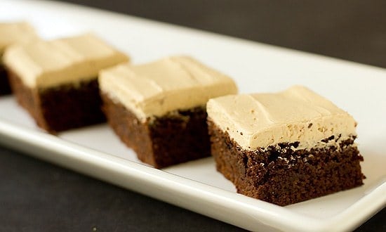 For most people, brownies are a cozy, heavy dessert that are baked primarily during the cooler winter months. I buck the trend. I start to crave brownies most when the birds start to chirp, the sun stays up until 8pm, and itโs shorts and bathing suit weather. Totally irrational, and probably not smart, but the taste buds want what the taste buds want. Apparently, my taste buds want rich, dense, fudgy brownies during the spring and summer months. So, I appease them. A few weeks ago, I fell head over heels in love with the Chocolate Fudge Brownies with Chocolate Buttercream Frosting. They took me back to my high school days, to a simpler time, a time when a really good brownie could right all of those teenage wrongs. I decided that I needed to make more frosted brownies in the future. As you can see, I didnโt wait very long. I positively adore my Mocha Cupcakes with Espresso Frosting, and decided that was the perfect next step in my frosted brownie journey.