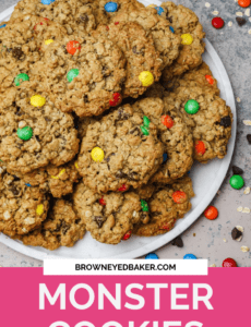 Monster cookies are everything good that there is about cookie-baking and candy-eating. These classic cookies are loaded with peanut butter, oats, chocolate chips, and M&Ms; they bake up soft, chewy, and thick, and are absolutely irresistible!