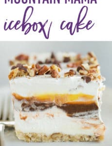 Mountain Mama Icebox Cake is a lush-style dessert with a pecan shortbread crust with layers of cream cheese, chocolate pudding, vanilla pudding and Cool Whip.