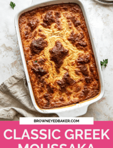 Similar to lasagna or a layered casserole, this traditional Mediterranean dish has sliced eggplant and potato rather than noodles. Between the layers are bites of spiced beef and creamy bechamel sauce. There are so many rich flavors and exciting textures, I couldnโt stop thinking about it for days. A few years after having it for the first time, I worked hard to find a recipe that gave me the same warm feeling โ and this is it!