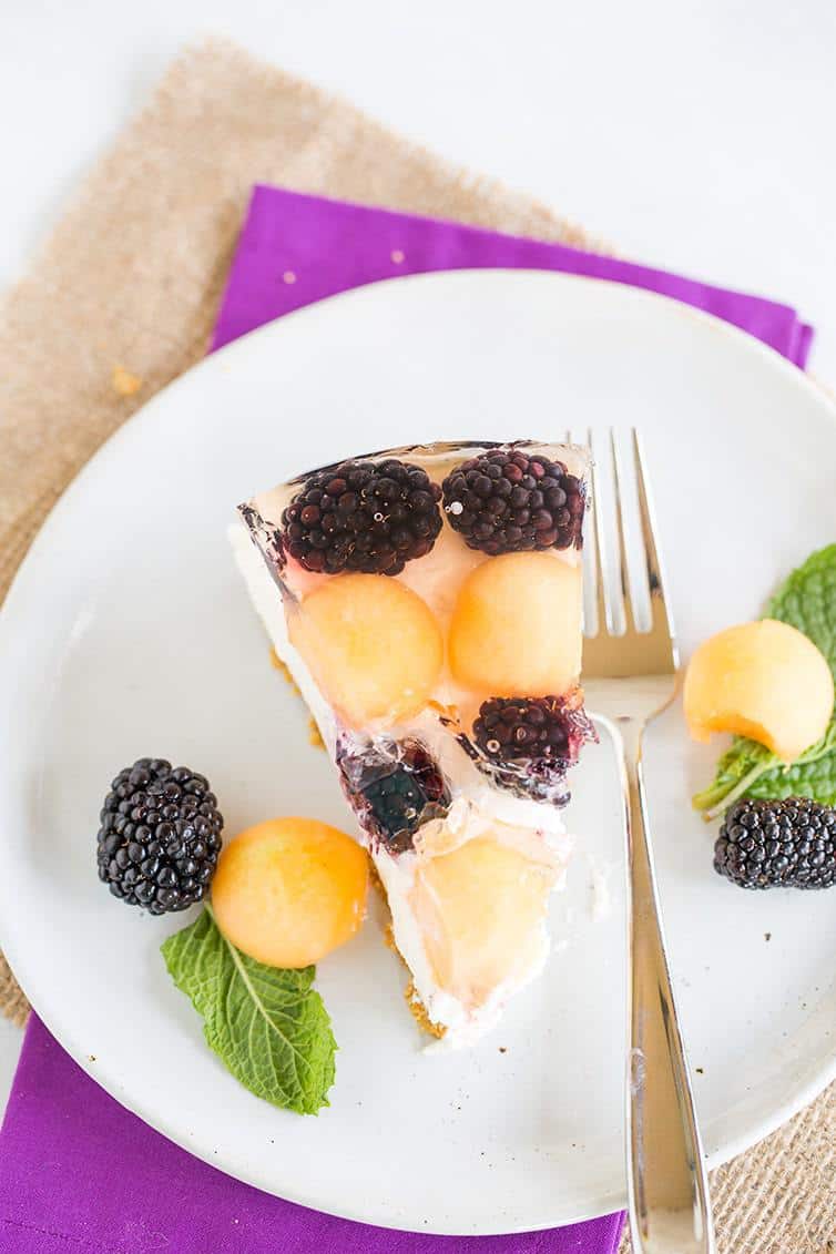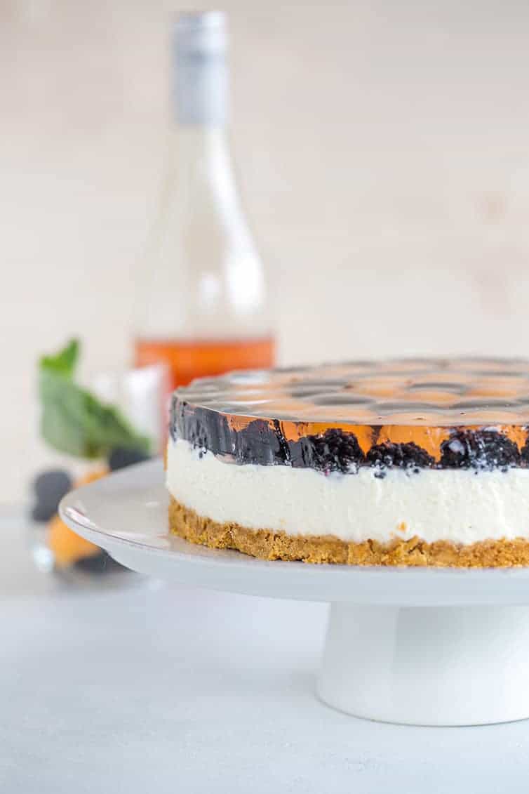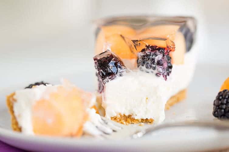 This no bake cheesecake has a graham cracker crust, is infused with rosé, and has a cantaloupe and blackberry rosé gelatin mixture sitting right on top. It’s easy, it’s summery, and it’s a total show-stopper of a dessert.