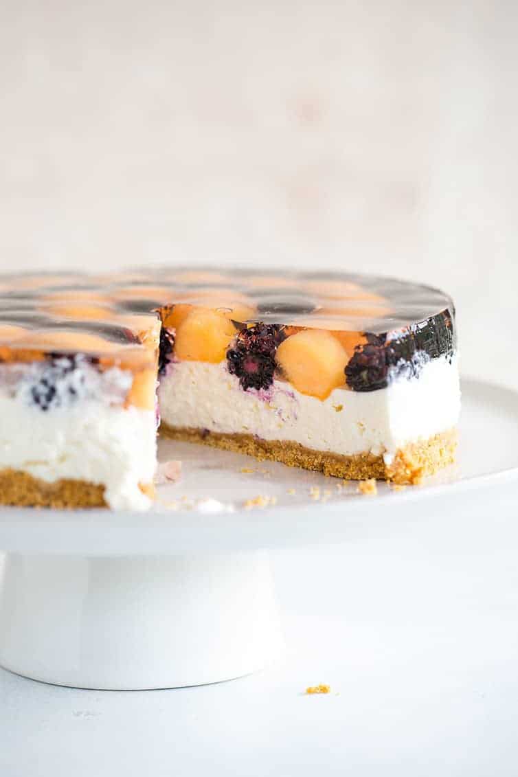 - Finish Assembling the Cheesecake: Lightly press the blackberries and cantaloupe onto the top of the cheesecake as desired. Refrigerate if the gelatin mixture is not ready yet. Once the gelatin mixture has reached the thick, syrup consistency, very slowly pour it over the fruit. Refrigerate for at least 4 hours prior to serving.