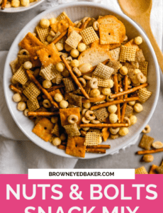 This nuts and bolts recipe is the ultimate homemade snack mix! Salted peanuts, five different kinds of cereal, crunchy pretzels, bagel chips, cheese crackers, and Worcestershire pair with a mix of seasonings and bacon drippings to make this everyoneโs favorite. Youโre going to want to keep a batch of this on hand at all times!