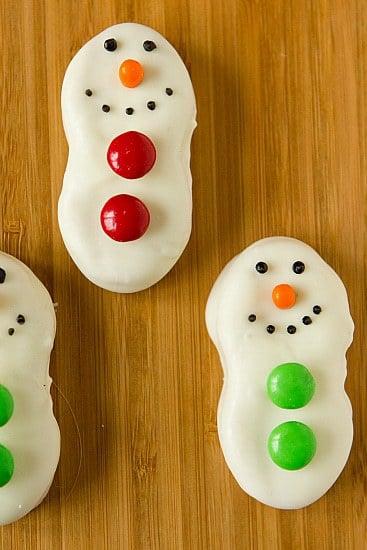 I had a bag of Wilton candy melts in the pantry so I used those, and they turned out some perfect snowmen. I chose to use the red and green M&M’s but if you think your snowmen would enjoy a flair of color, by all means use whichever you’d like!