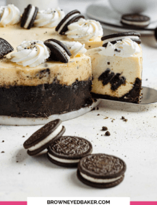 This is seriously THE BEST cookies and cream cheesecake you will ever eat! It bakes up super rich and creamy, and it has minimal cracking without using a water bath.