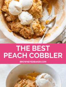 This classic peach cobbler recipe is incredibly easy to make from scratch, using fresh peaches and a blend of sugar and spices, and a rustic biscuit dough on top, baked until browned and bubbling. Truly the BEST! Itโs a most amazing summer dessert, but you can also substitute canned or frozen peaches and enjoy it year-round. Topping with vanilla ice cream is optional, but highly encouraged!