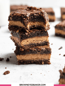 A peanut butter filling that tastes just like the inside of a peanut butter cup is sandwiched between two layers of the best chewy, fudgy homemade brownies for an incredibly rich and decadent dessert.