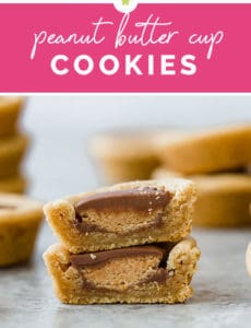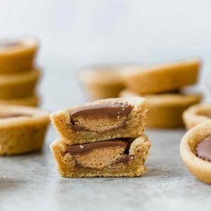 This peanut butter cup cookies recipe is a total classic! My mom has had this recipe in her little index binder since I was barely old enough to reach the counter, and I would devour them every single year. This super simple recipe has you bake peanut butter cookies in a mini muffin pan until theyโre just barely done, then a Reeseโs mini peanut butter cup is pressed into the center; an absolute Christmas staple!