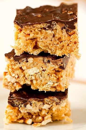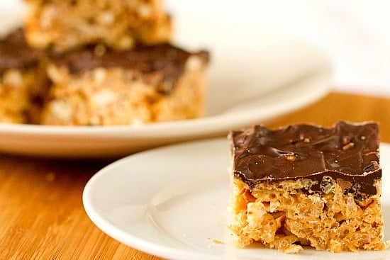Do you remember the amazing Chubby Hubby Truffles from a month or so ago? The truffles that I fashioned after my favorite ice cream of all time – Ben & Jerry’s Chubby Hubby? For those of you who may not have heard of it, Chubby Hubby consists of vanilla ice cream chock full of peanut butter-filled, chocolate-covered pretzels. It got me through college, and I still can’t get enough of that flavor combination to this day. Given how much I loved the truffles, and how much you all said you loved the truffles, I started brainstorming about other things that I could put a chubby hubby spin on and came up with these peanut butter-pretzel Rice Krispies treats topped with chocolate. Talk about addicting!