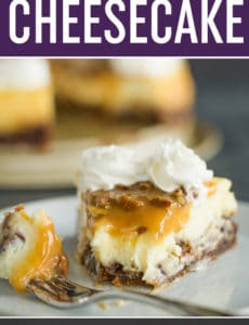 First, we have a traditional graham cracker crust, which is then topped with a layer of pecan pie filling. On top of THAT is a traditional cheesecake. Once itโs chilled and set, I spooned a bit of pecan praline sauce over top, swirled on some whipped cream, and sliced it up.