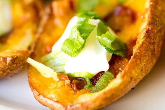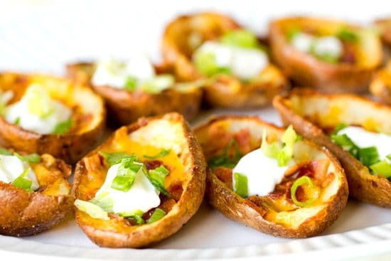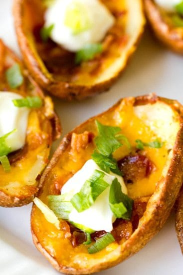 Iโve been in love with potato skins since I was a kid and my cousin worked at a small diner-style restaurant in our town. My mom would take my sister and I there to say hi and get a bite to eat. The only thing I remember from those little trips were potato skins. Since then, Iโve gravitated to potato skins on every appetizer menu Iโve seen. Theyโre crispy potato skins filled with cheese and bacon, topped with sour cream and green onions. Basically, these are everything that is good about appetizers. And football season. And life. Make them, love them, and cheer on your favorite team.