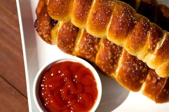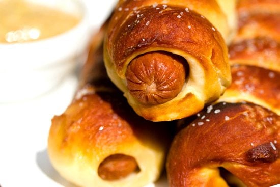 When I was a kid, I only ate hot dogs one of two ways: nearly burnt to a crisp on the grill, or wrapped in crescent rolls and baked in the oven. The former typically happened during the summer, while the latter was almost always a fall and winter treat. My mom would kick the crescent-wrapped dogs up a notch by slicing the hot dogs down the middle and stuffing a half-slice of American cheese in the middle. As far as my 8-year-old palate was concerned, that was just about as gourmet as you could get. That was my favorite way to eat hot dogs for years and years… until I discovered pretzel dogs. I have been a soft pretzel lover for what seems like forever, so imagine the shock and awe when I discovered hot dogs wrapped in soft pretzel dough. I don’t eat hot dogs very often, but a few times a year, I’ll have one either straight from the grill, black and charred, or wrapped in a buttery soft pretzel, which is usually accompanied by copious amounts of outlet shopping. For some reason, it never occurred to me to make them at home. Until now. Which is definitely cause for celebration.