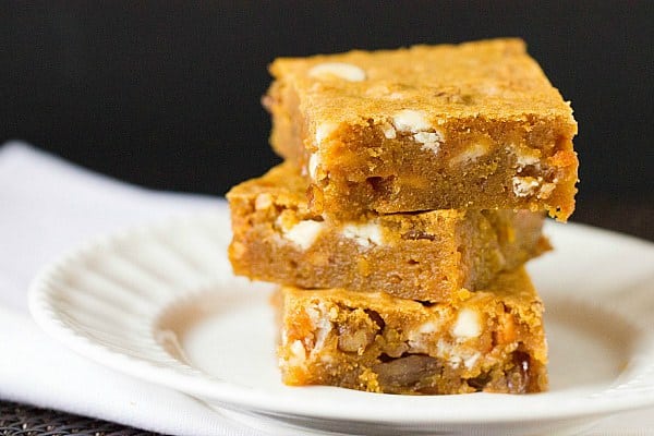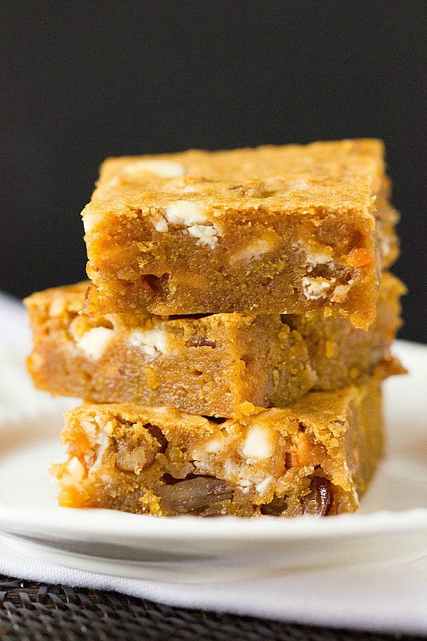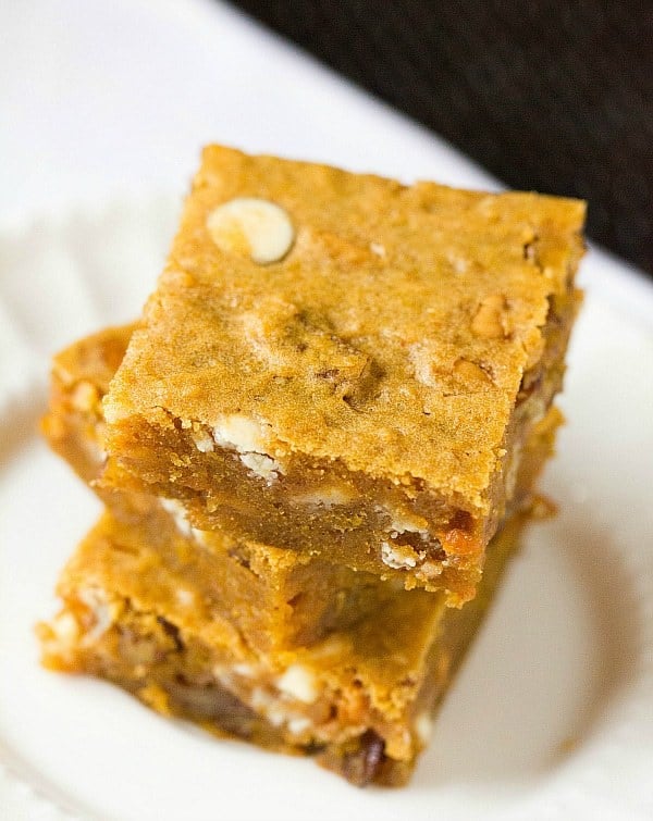 In addition to pumpkin, these bars are chock full of butterscotch chips, white chocolate chips and chopped pecans. Every bite is an explosion of flavors, textures, and gooey pumpkin deliciousness. If youโre looking for a quick and easy dessert to get you through passing out candy or a scary movie marathon tonight, these definitely have your name written all over them.
