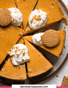 I used the base from my Fig and Almond Cheesecake with Crรจme Anglaise. From there I wanted to keep things simple so I used canned pumpkin, tons of favorite fall spices I had in the pantry, and a box of gingersnaps. It was delicious and absolutely blew everyone away.