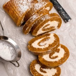 I originally shared a pumpkin roll recipe seven (!!) years ago, but have tweaked it a bit into a new and improved recipe here. The ingredients are mostly the same, but Iโve upped the warm spices significantly (if you donโt have pumpkin pie spice, be sure to check the notes for a link on how to make your own!), and added a bit of vanilla because nearly everything is better with vanilla.
