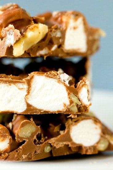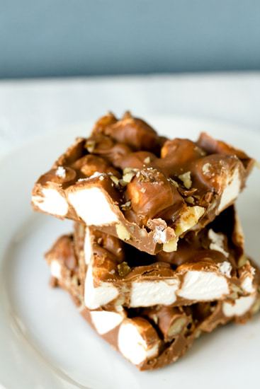 - Melt the chocolate over a double boiler (or in 30-second intervals in the microwave on 50% power, stirring after each). Once the chocolate is melted, remove from the heat and let sit for a few minutes to cool slightly, stirring occasionally. Add the marshmallows and walnuts and stir to combine.