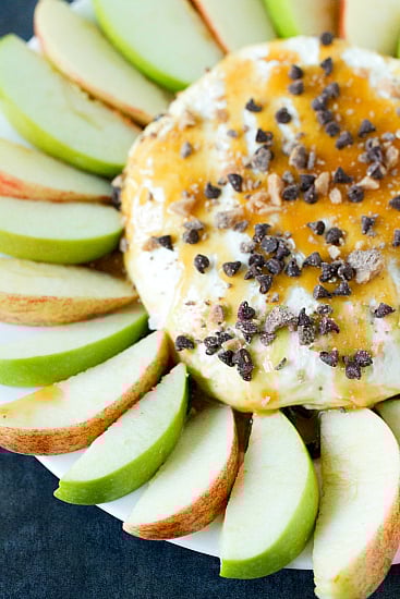 I was never big into caramel apples when I was a kid, or even much as an adult, until a couple of years ago when my husband and I took a quick weekend trip to Toronto during the fall. After visiting the Hockey Hall of Fame, we were walking through a shopping area and came across a store with some of the most exquisite-looking caramel apples I had ever seen. My sweet tooth couldn’t walk out of there without buying at least one apple (in actuality, I think I ended up with at least three), and I’ve been dreaming of caramel apples during this time of year ever since. Those apples were the inspiration behind my first homemade caramel apples, and they’re the first thing I thought of when I laid eyes on this dip recipe. It’s everything that’s fabulous about caramel apples, and it tastes like cheesecake. Total win.