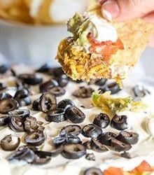 Itโs basically an all-star lineup of components fromย every amazing Mexican dip you can think of โ bean dip, cheesy stuffed jalapeรฑos, guacamole, salsa, and all topped off with sour cream and olives.