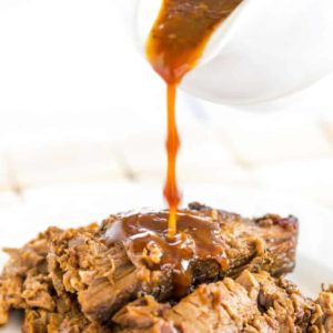 Since brisket is typically cooked “dry”, this recipe has you place the brisket on top of an overturned loaf pan inside the slow cooker so that it’s elevated and not cooking in the released juices. It was fall-apart tender out of the slow cooker, and turning the juices into a quick homemade barbecue sauce that can be served alongside the brisket was delicious.