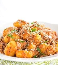 We made this for dinner this evening. We had a ton of extra liquid (from the meat?) it was almost overflowing the slow-cooker crock. I poured it into a pan to reduce it before I added it back to the slow-cooker, which gave everything a really meaty flavor. And we couldn’t find dried gnocchi so we had to use frozen. But even with all the minor inconveniences this was totally worth it. Delicious!