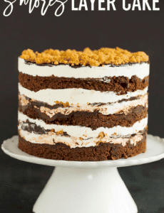 This sโmores cake is built Milk Bar style โ layers of chocolate cake, toasted marshmallow frosting, fudge sauce, and graham crust crumbs!