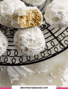 These rich, buttery snowball cookies are a heavenly addition to your holiday cookie trays! Sometimes called โMexican Wedding Cookiesโ or โRussian Tea Cakesโ, this recipe has a shortbread base and is loaded with pecans (or walnuts!), creating a nutty, crunchy cookie, and loads of powdered sugar, for the perfect melt-in-your-mouth bite! These have long been a favorite of mine, and I hope youโll enjoy them, too!