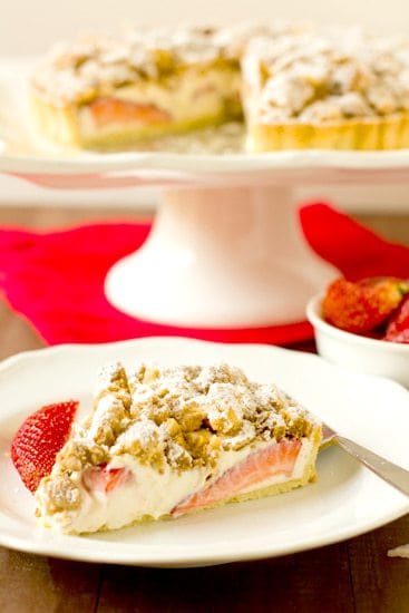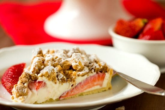 When it comes to dessert, I am always a cheesecake-first gal. My taste buds are fiercely loyal to that smooth, creamy, cream cheese filling, and they usually refuse to be swayed in any other direction. Running a close second to cheesecake is anything topped with crumbs. Dutch Apple Pie and Crumb Cake rank right up there at the top of my sweets food chain. If I can’t eat cheesecake or chocolate, you better believe I’m going after a crumb topping! So it’s no surprise that when I came across a recipe that combined a cream cheese filling with a crumb topping, I was nearly salivating. Throw in a tart crust, fresh strawberries, and virtually no bake time, and you have the epitome of what summertime desserts should be.