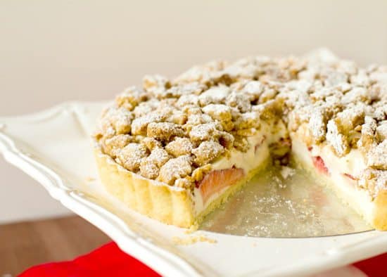 - Assemble the Tart: Spread half the cream cheese filling on the bottom of the tart crust and arrange the sliced strawberries on it, cut side down. Spread the remaining filling over the strawberries. Evenly scatter the crumb topping over the filling. Right before serving, lightly dust the topping with powdered sugar and garnish with additional strawberries, if desired. Unmold the tart from the pan and place it on a platter. Wrap and refrigerate leftovers.