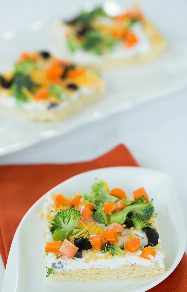 Veggie pizzaย was one of my momโs go-to party appetizers when I was a kid โ layers of crescent roll dough, topped with ranch-flavored sour cream and chopped fresh veggies and shredded cheese.