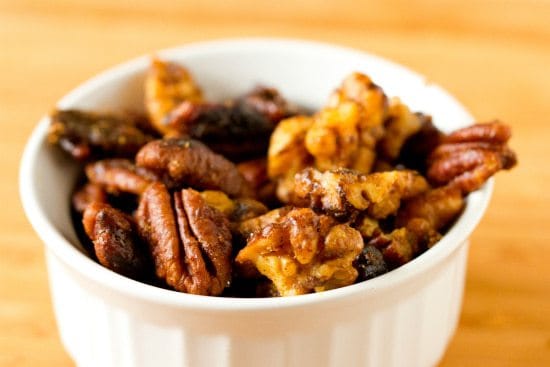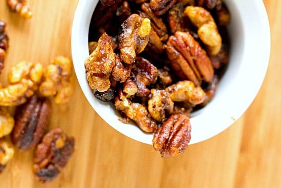 They are mostly spicy, but have a sweet undertone, which is the perfect balance. I used pecans and walnuts here, but you could easily substitute any combination of your favorite nuts – cashews, brazil nuts, hazelnuts, peanuts… whatever tickles your fancy. A great snack with a nice kick!