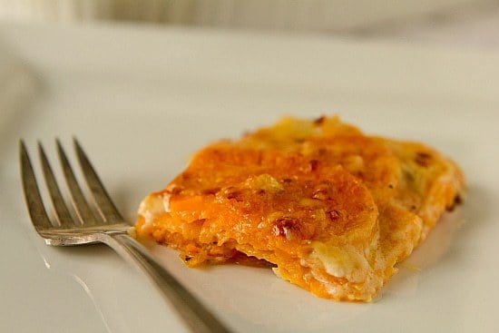 As you all know, Iโm not much of a vegetable person. I make veggie lovers cringe and shake their heads in embarrassment. I do, however, LOVE sweet potatoes. Baked sweet potatoes, roasted sweet potatoesโฆ pretty much however you want to prepare them, Iโll eat sweet potatoes. Unless of course you make one of those overly sweet candied sweet potato casseroles with marshmallows on top. That I have never, ever loved, but it was always a Thanksgiving staple. Last year when I set my sights on re-making the cranberry sauce, green bean casserole and a few other things, I went about looking for a new way to bring sweet potatoes to the table. I gave two recipes a test-run last year, one was the Mashed Sweet Potato Brulee, which I shared last year, and this Sweet Potato Gratin. Think scalloped potatoes, but with sweet potatoes. And lots of delicious Gruyรจre cheese. Which could sell me on eating pretty much anything.